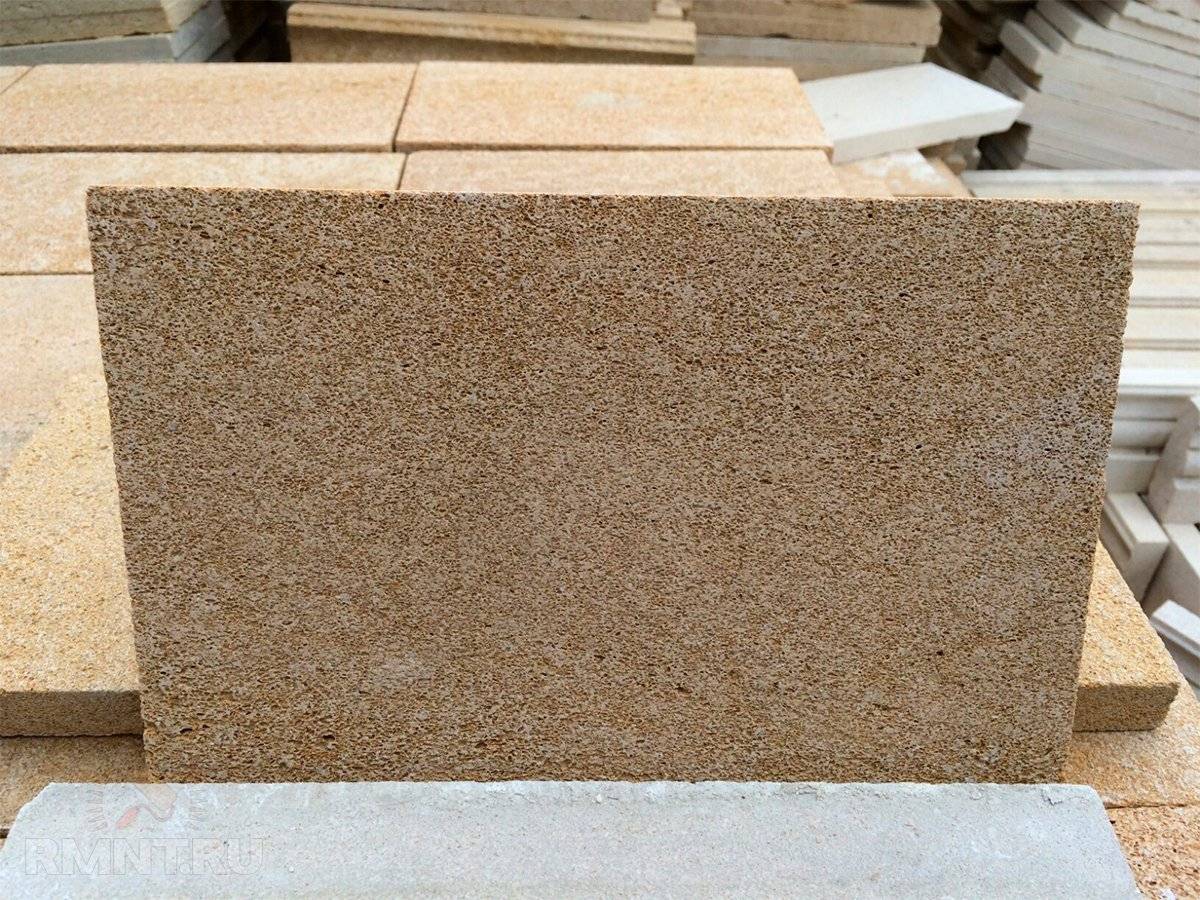 Известняк. Самый распространенный и недорогой вид плитки, получаемый в результате переработки обломков горных пород органического происхождения. Морозоустойчив, но способен поглощать влагу, поэтому нуждается в гидрофобизации.