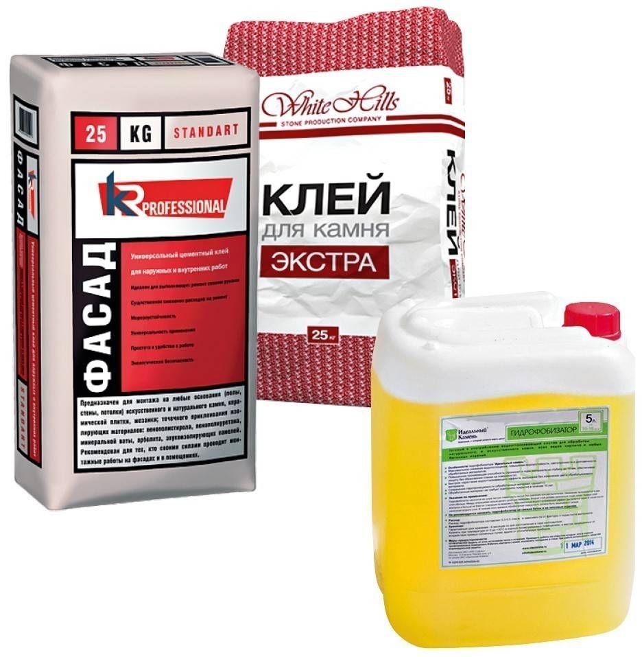 Производители облицовочного камня предлагают фирменные расходные материалы: клеи, затирки, гидрофобизаторы. Фото: KR-Professional, White Hills, «Идеальный камень»