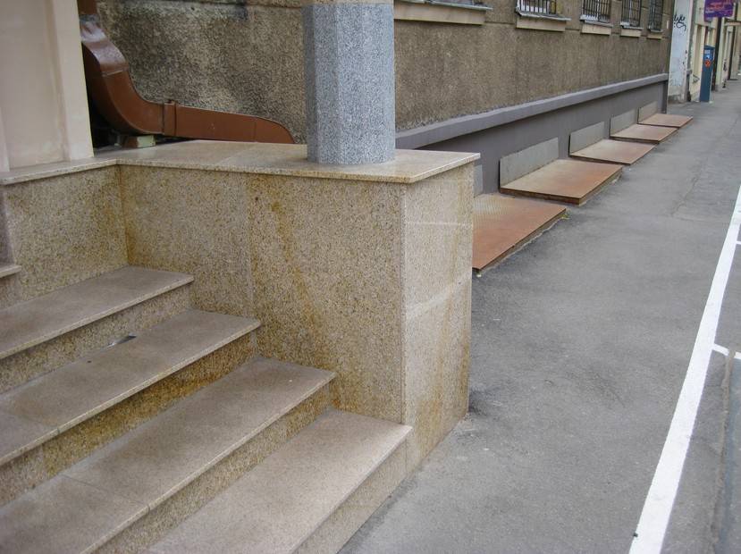 - Необходима тщательная очистка поверхности фасада от любых отделочных материалов (декоративная штукатурка, гипсовая отделка и другие), использованных ранее. Гранитная укладка должна производиться только на поверхности, покрытой штукатуркой высокого качества. Низкое качество слоя штукатурки может привести к отвалу облицовочных плит.