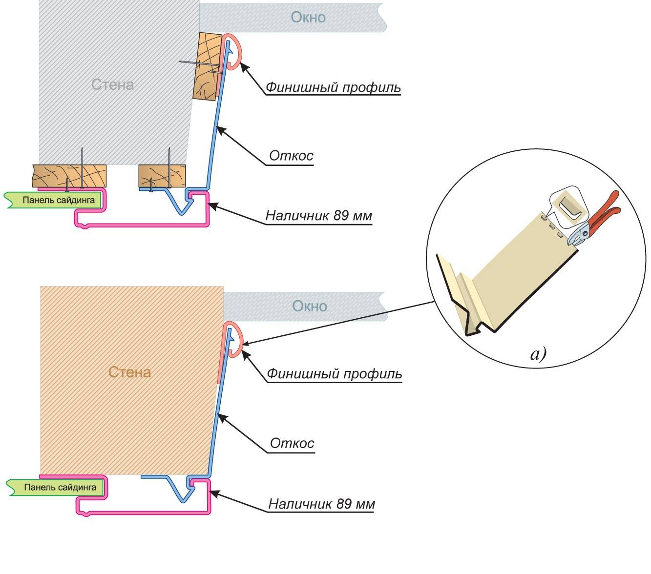 Установка начинается с водоотлива. Он является жесткой конструкцией, поэтому крепиться легко. После чего, при помощи саморезов крепят угловые профили. Следующий этап – крепеж стартовой планки на водоотлив вдоль разметки. По периметру окон выполняется крепление оконных планок или J-профилей так, чтобы расположение наружного нижнего края было немного ниже внутреннего.