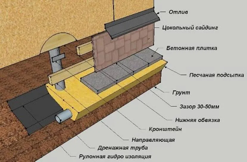 Также при строительстве выступающего цоколя необходимо сделать откосы на его верхней грани, чтобы избежать застоя дождевой воды.
