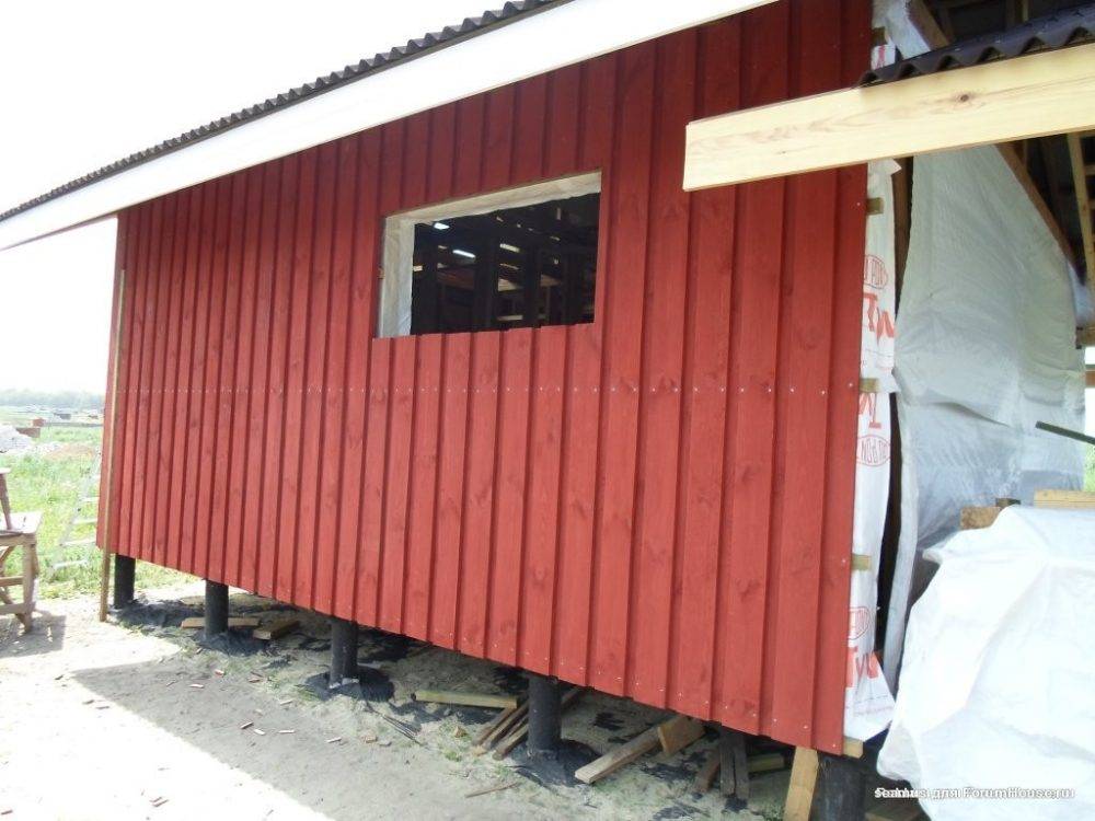 Поэтому пирог фасада каркасного дома с имитацией бруса или фасадной доской обычно выглядит так: Внутренняя отделка (ГКЛ или вагонка) — пароизоляционная пленка — каркас с утеплителем — ОСП-3 (финны вместо нее ставят мягкую ДВП и не ставят тогда мембрану) — гидроветрозащитная мембрана — контробрешетка 50×25 — фасадная доска.