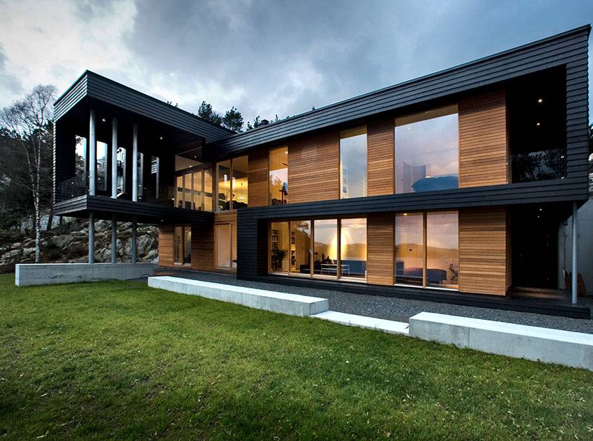 Скандинавский стиль подразумевает использование дерева, камней. Прямые, лаконичные формы, естественные природные цвета в отделке. Со всеми этими условиями легко справятся фасадные панели, как натуральные, так и с использованием композитов. Экстерьер оформляется чёткими геометрическими линиями, контрастными цветами, в коричневых, бежевых красных и серых тонах.