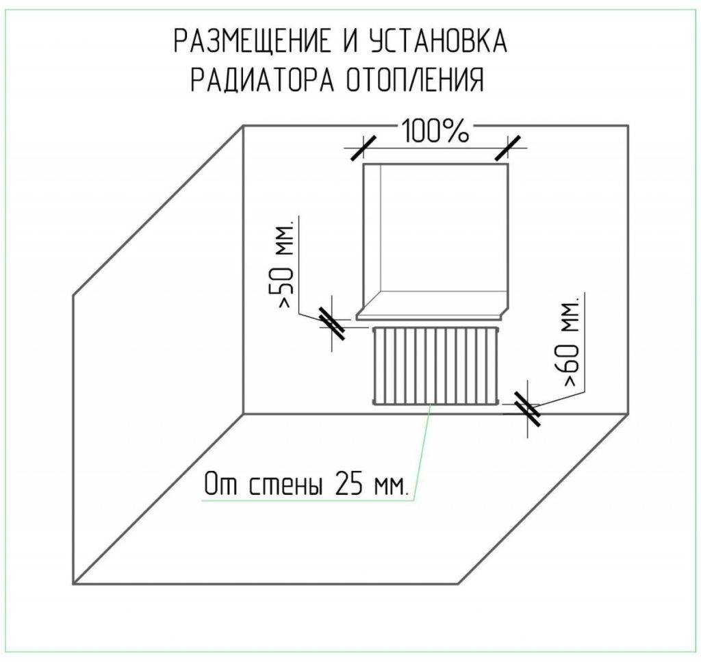 Радиатор должен быть установлен под каждым окном в квартире, так как он выполняет функцию тепловой завесы и обогревает стекло. В идеале ширина радиатора должна быть приближена к ширине окна.
