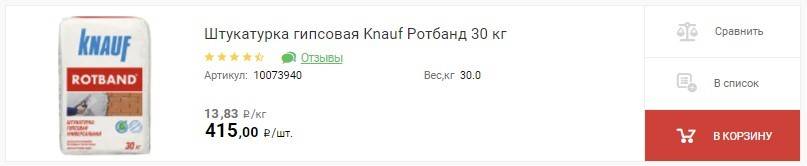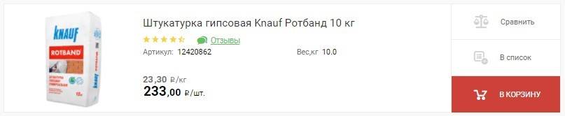 Детальную ценовую политику гипсовой штукатурки и описание к товару можно найти в каталоге товаров на официальном сайте Леруа Мерлен. Возле каждого товара указана цена как за 1 кг, так и за мешок. Упаковки предлагают весом 5, 10, 30 кг. Стоимость их в зависимости от веса – 150-415 рублей за мешок.