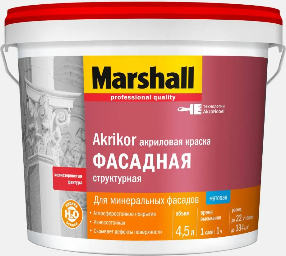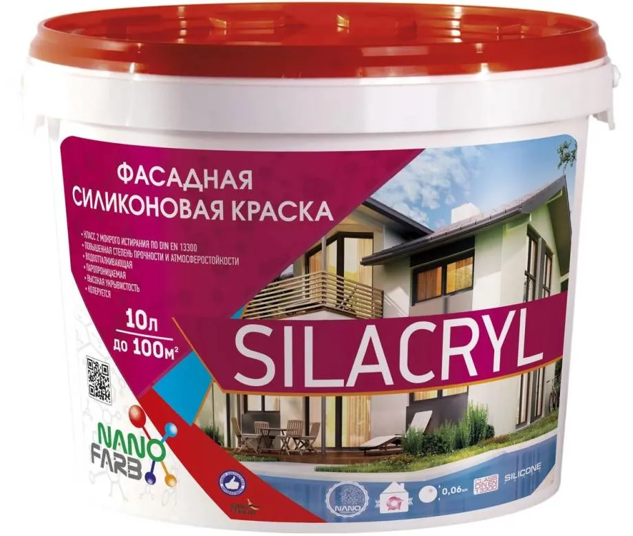 - Фасадный акриловый краситель является водно-дисперсионным составом, а пленкообразующим веществом служит полиакриловый полимер. Защитно-декоративное покрытие получается непрозрачным, с высокой стойкостью к истиранию.