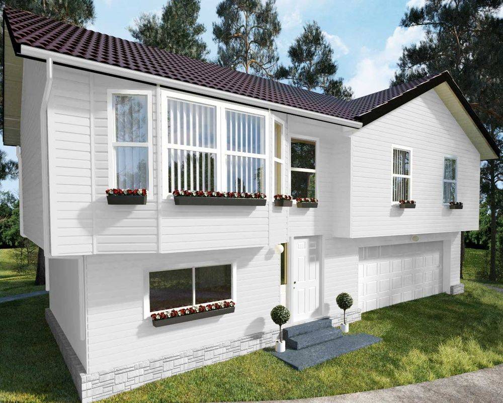 На фото изображен загородный дом, фасад которого обшит белым виниловым сайдингом