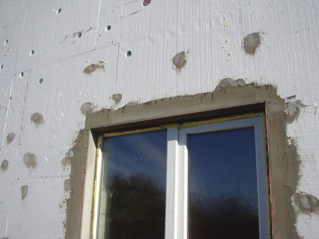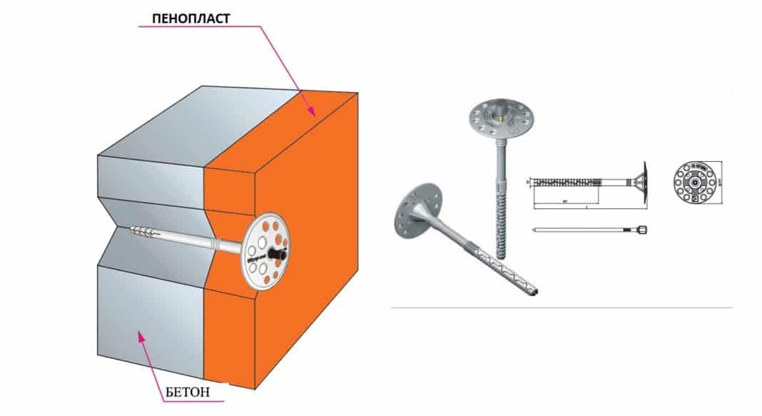 Через 2-3 суток после укладки пенопласта с применением клея отделку дополнительно закрепляют зонтичными дюбелями. Используют 3-5 зонтиков для дополнительной фиксации плиты с площадью в 0,5 м², закрепляя углы облицовки и центр: