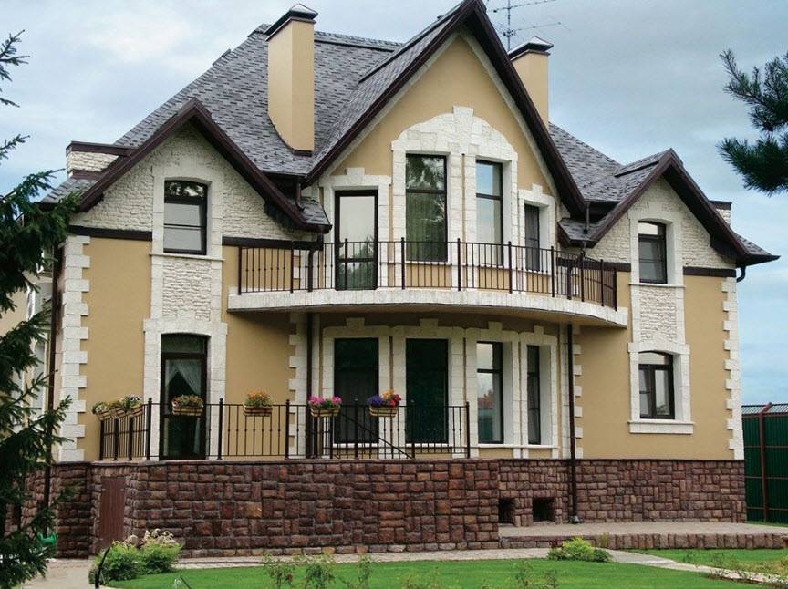 Этот вариант не предусматривает столь популярное на сегодня наличие устройства утеплительного фасадного слоя. Однако все таки комбинировать материалы можно, особенно можно брать современные штукатурные составы и выполнять работу по формированию рустов при помощи их.
