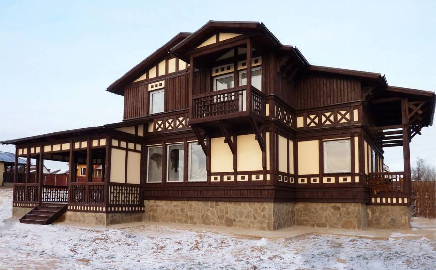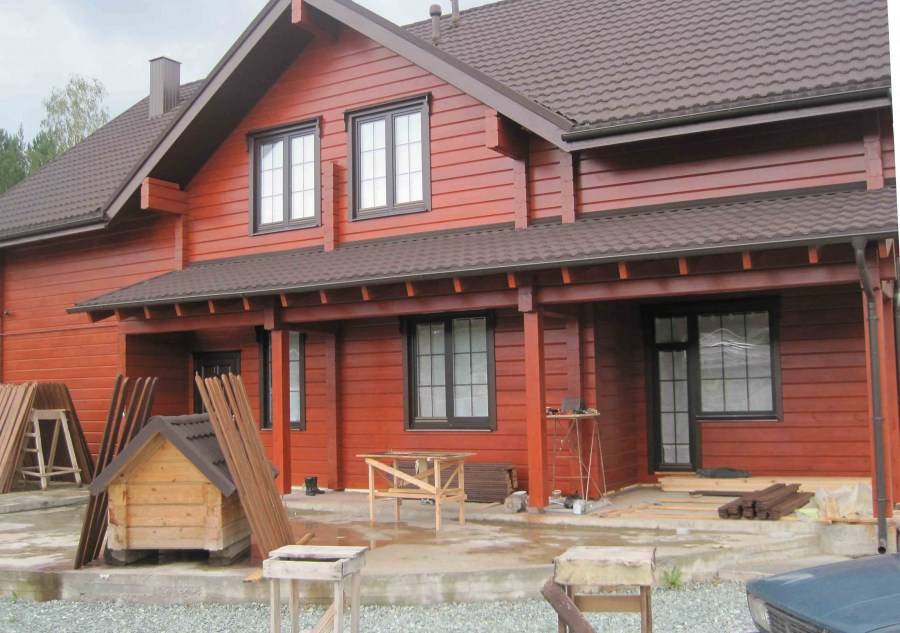 Если же выбран такой вариант для отделки, заботятся о защите от разрушительных факторов. Фасад обрабатывают влагоотталкивающими составами и увеличивают свес крыши.