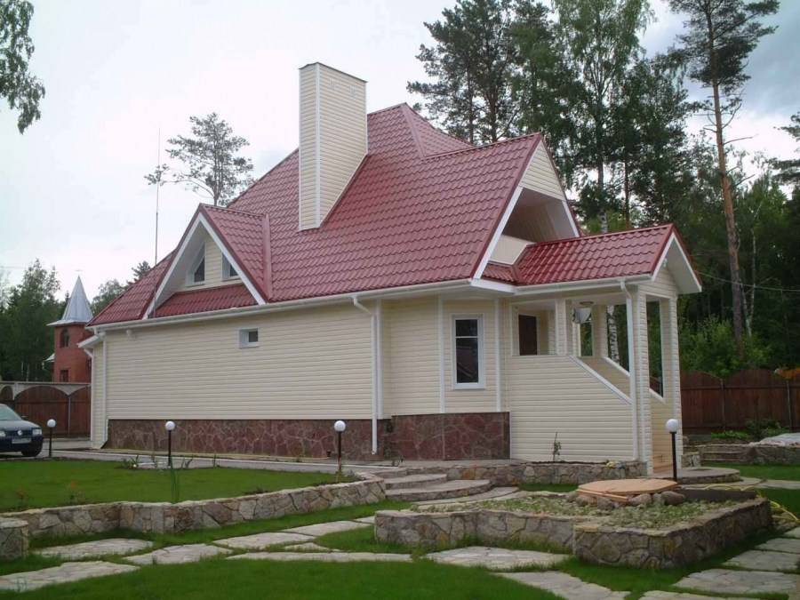 - Очень часто хозяева дома покупают кровельный материал одного цвета с фасадом дома. Если выбор делается в пользу одного цвета для крыши и стен дома, то цвета необходимо разделять хотябы оттенками, например стены сделать светлее, а крышу темнее (или наоборот)