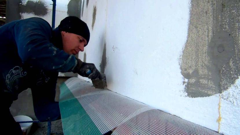 Пример, как наносится штукатурка по пенопласту своими руками: на видео показан процесс монтажа армирующей сетки.