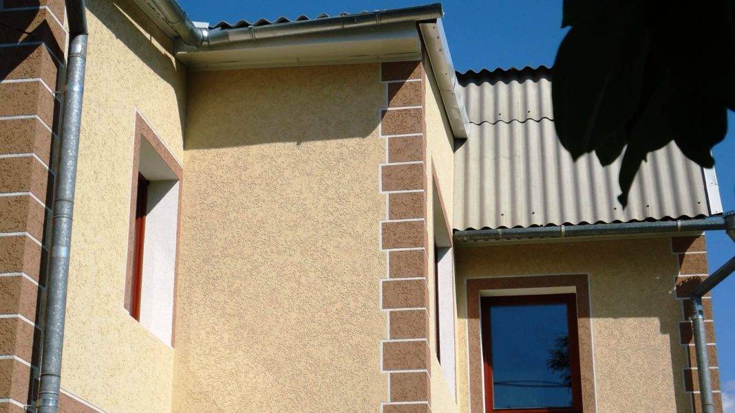 - Акриловая фасадная. Требует после высыхания покраски, имеет расход при отделке фасада в 4,4 кг на каждый квадратный метр. Используется, если слой отделки подразумевается тонкий. Имеет разный размер наполнителя. Но наносимый слой штукатурки должен быть толще, чем диаметр зерна.