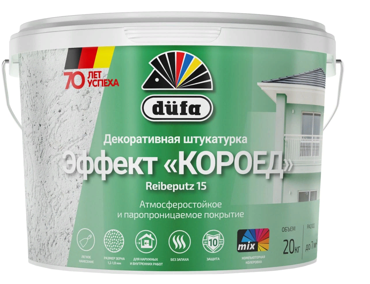 Размер гранул мрамора, которые добавляются в смесь, составляет 1-3,5 мм, и именно они обеспечивают выразительность поверхности. Чем больше зерна, тем шире и глубже будут узоры. Штукатурная облицовка короед производится с основным компонентом из гипса, цемента или акрила с наполнителем из мелкого мрамора или минеральных твердых гранул. Акриловая смесь продается в подготовленном к работе виде (мокрой), а цементная и гипсовая – как сухая смесь, которую нужно затворять водой перед нанесением. Основной цвет всех смесей — белый, но любая марка может оттеняться любым колером, который продается отдельно. После нанесения и высыхания штукатурки ее можно окрашивать любыми красками, но рекомендуется акриловыми, чтобы поверхность дышала.