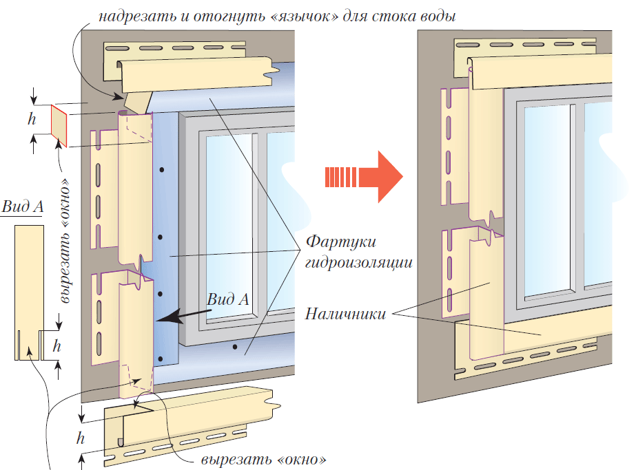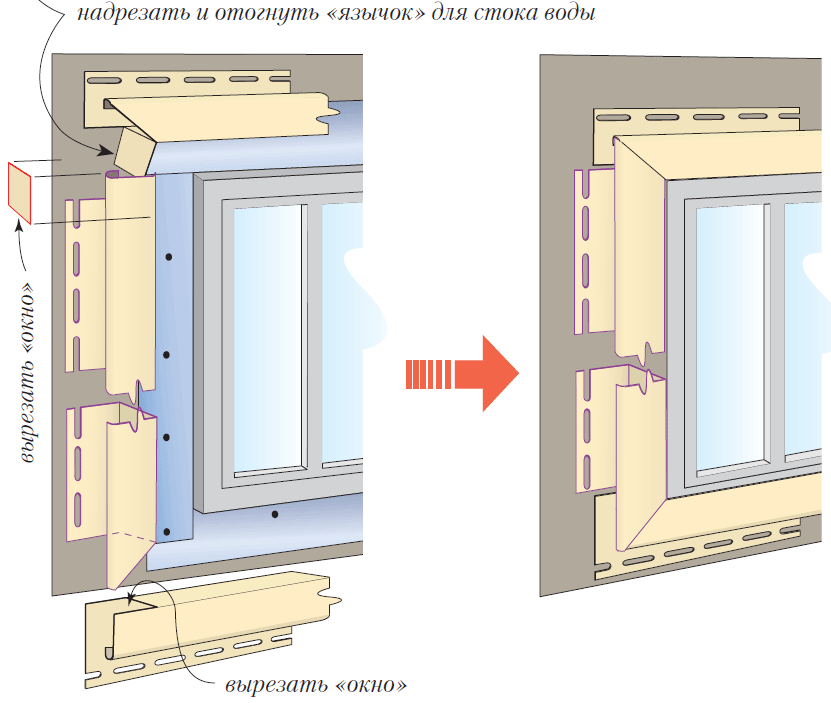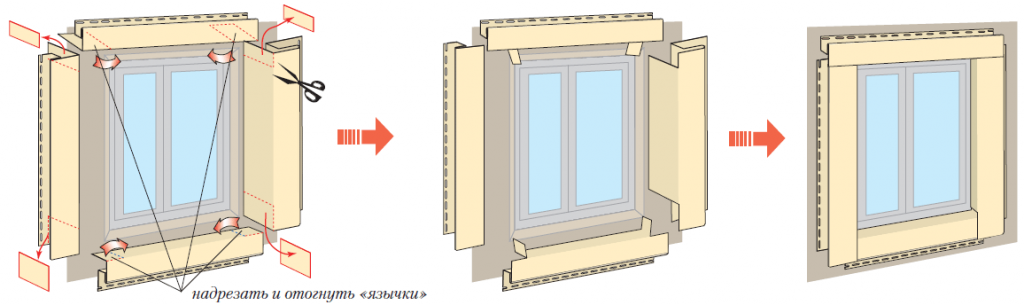 Если фасад и обрамляемый проем находятся в одной плоскости, то надрезанные кусочки винила отгибают внутрь нижнего профиля или просто удаляют.
