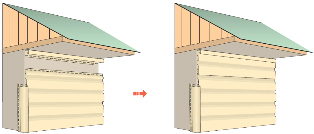 Завершая монтаж сайдинга своими руками, под крышей крепится финишный или J-профиль (если вы этого не сделали в самом начале) (Рис. 17).