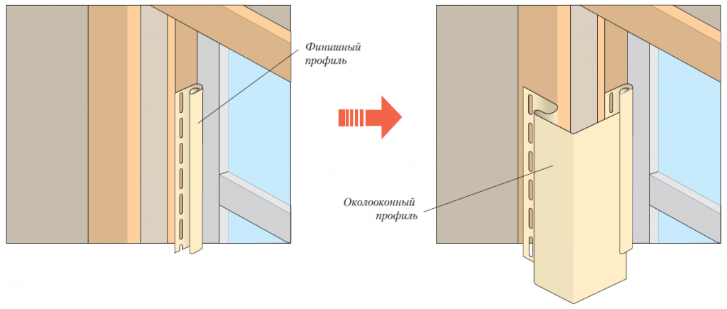 Если оконные или дверные проемы находятся в одной плоскости с фасадом, на них крепятся стартовые J-профили или наличники.
