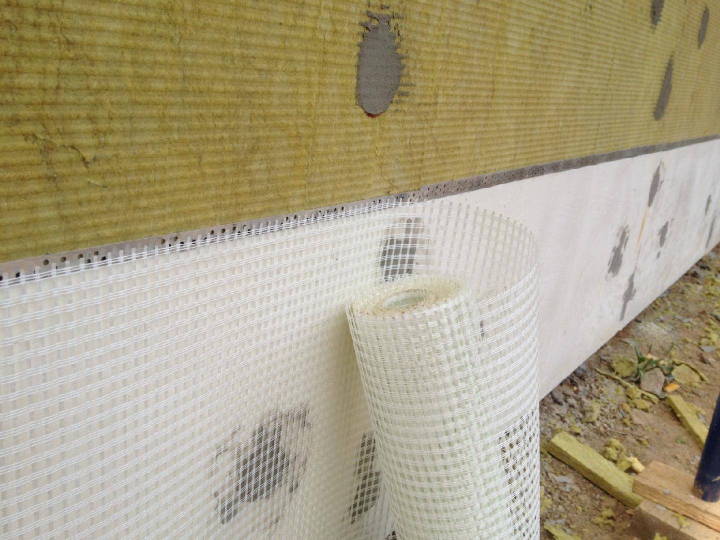 Перед нанесением штукатурного слоя, поверхность плит утеплителя предварительно упрочняют армирующей сеткой. Для этого, плиты утеплителя покрывают слоем специального клея, в который вдавливают армирующую сетку из стекловолокна. Поверх сетки наносят выравнивающий слой клея. Армирующая сетка из стекловолокна имеет размер ячеек 3-6 мм.