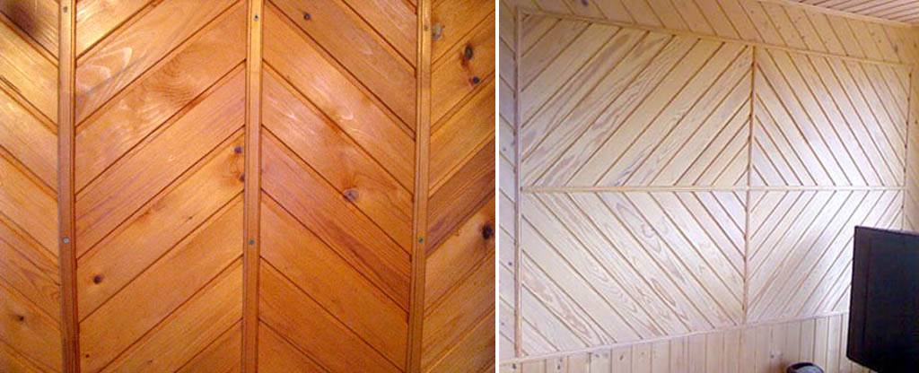 Диагональная обшивка вагонкой применяется редко, т.к. сложна и дает большой отход материала, а эстетически почти не выигрывает. Фасонных обшивок вагонкой много; можно заметить, что, напр., обшивка плоской елочкой (слева на след. рис.) трудоемка, но не так сложна, как кажется: фрагменты нарезаются по шаблону в стусле и монтируются на вертикальную обрешетку. Шикарно выглядят, но сложнее панели-ромбы из вагонки, справа на рис. Обрешетка под них представляет собой крест с обрамлением, в квадрантах которого крепятся бруски под диагональную обшивку, см. ниже.