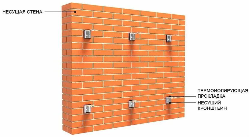 Система крепежей представляет из себя металлический каркас, который крепится непосредственно к стене и держит на себе облицовочный материал. В систему входят анкерочные и крепежные детали, несущие профили и кронштейны. Расстояние между стеной и фасадной отделкой регулируется при помощи специальных кронштейнов, которые проходят через слой утеплителя.