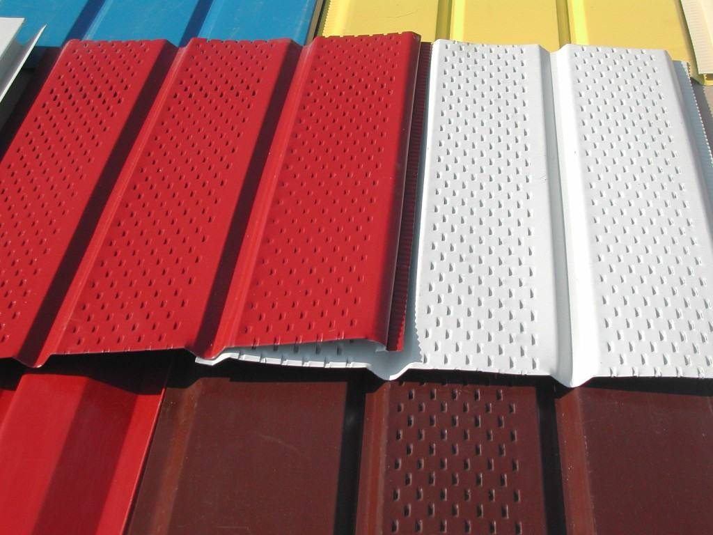 - Софит – листы, используемые для облицовки поверхностей горизонтального положения. Могут быть как сплошными, оснащенными перфорацией по центру или по всей площади. Отверстия перфорации гарантируют хорошую вентиляцию фасада строения.